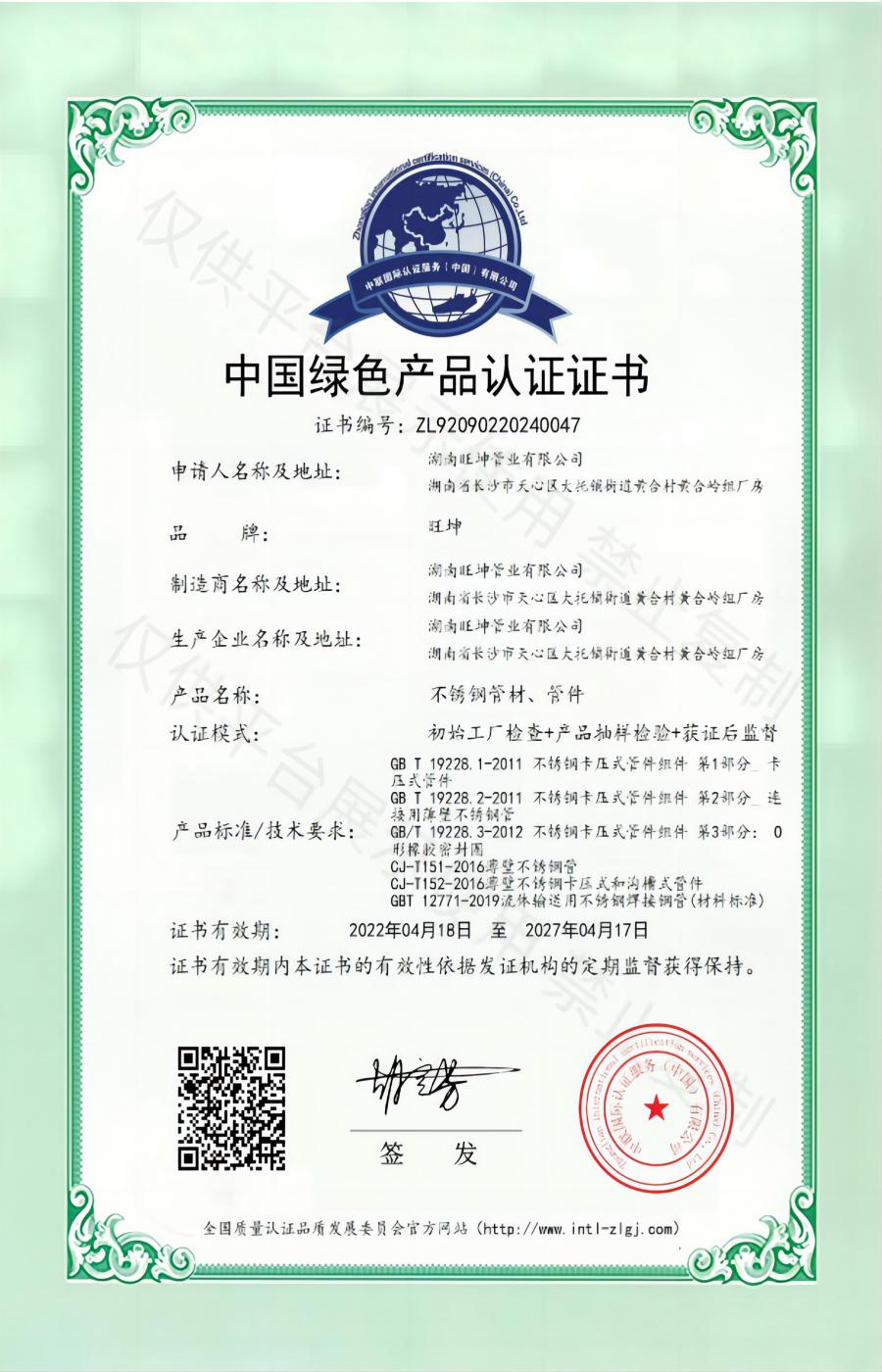 中国绿色产品认证证书