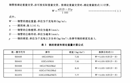 钢管按理论重量交货,亦可按实际重量交货。按理论重量交货时,理论重量按式 (1) 计算: