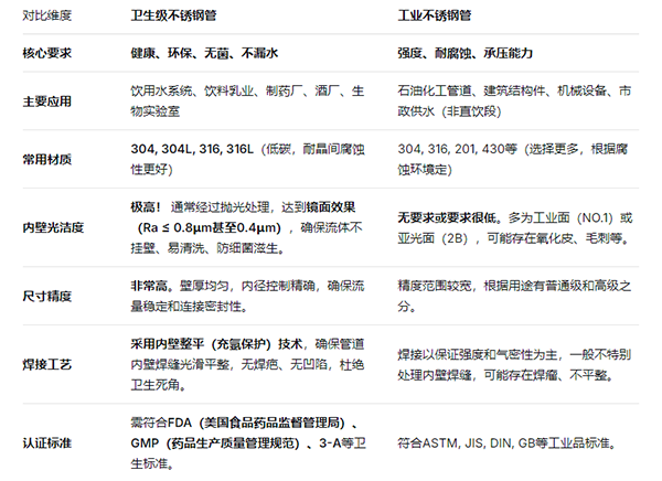 总而言之,卫生级不锈钢管和工业管虽然都叫“不锈钢管”,但从诞生之初就走向了截然不同的道路。 它们之间不是谁好谁坏的简单问题,而是 “专业对口” 的问题。